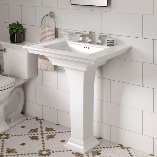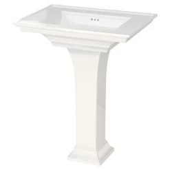Town Square S Pedestal Sink by American Standard introduces a sense of classic architecture into any style of bathroom, whether it is traditional or transitional. Elegant architectural details such as crown molding and stately square shapes accent this signature design for a perfectly coordinated collection, making it easy to create a bathroom space that looks great for years to come. The pedestal sink allows for a space-saving option, while still providing a generous useful working space in the bathroom.