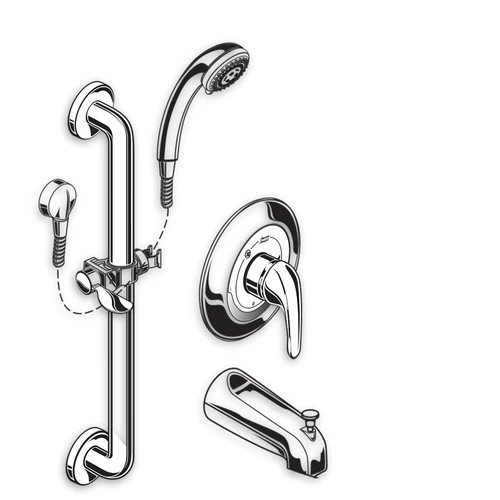 Complete commercial shower system includes: an R121SS pressure balance valve and trim, a wall supply with 1/2″ NPT female inlet and 1/2″ NPSM male outlet, a 59″ (1500 mm) metal shower hose, vacuum breaker, a 3-function water-saving personal shower with pause feature, slip-on diverter tub spout and a 36″ slide-grab bar. Valve features a cast brass body, washerless 47 mm ceramic disc valve cartridge with volume and temperature control, back-to-back capability, integrated check valves and hot limit safety stop. Pressure balancing cartridge maintains constant output temperature in response to changes in relative hot and cold supply pressure. Universal inlets/outlets. With screwdriver stops. Rough-in plaster guard designed for use as thin wall mounting adapter. Durable metal handle. 3-function water saving hand shower with pause feature and 1.5 gpm/5.7 Lmin. flow restrictor. Slide bar features an adjustable hand shower holder which can be set at any height or position along the bar and angle up to 45?.