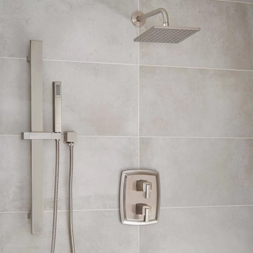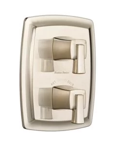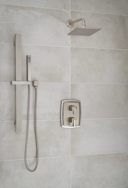 The Townsend two-handle thermostatic valve trim from American Standard features stately, architecturally inspired design with elements influenced by the Manhattan bridge. The top handle is used to turn the shower on and off, and allows for volume control of the shower flow, and, when used with either the R522 or R523 valve, can divert to multiple shower outlets. The bottom handle is used to perfectly adjust the temperature to suit your preferences. With its monumental design, offered in four beautiful finishes, the Townsend two-handle thermostatic shower valve makes a statement while coordinating beautifully with a wide range of color palettes and design styles.