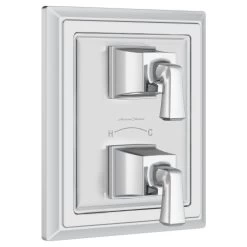 American Standard Town Square S Two-Handle Thermostat Shower Valve Trim provides a beautiful option for your shower system. The design has versatile appeal, with square shapes and classic architectural details inspired by crown molding, for a trim that looks amazing paired with any decor. As part of the Town Square S collection, other bathroom fixtures and fittings are available for a total design solution, making remodeling your bathroom easy.
